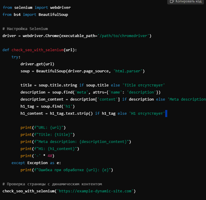 • Динамические сайты: С использованием Selenium можно проверять даже те сайты, которые загружают контент через JavaScript, что делает аудит более точным.