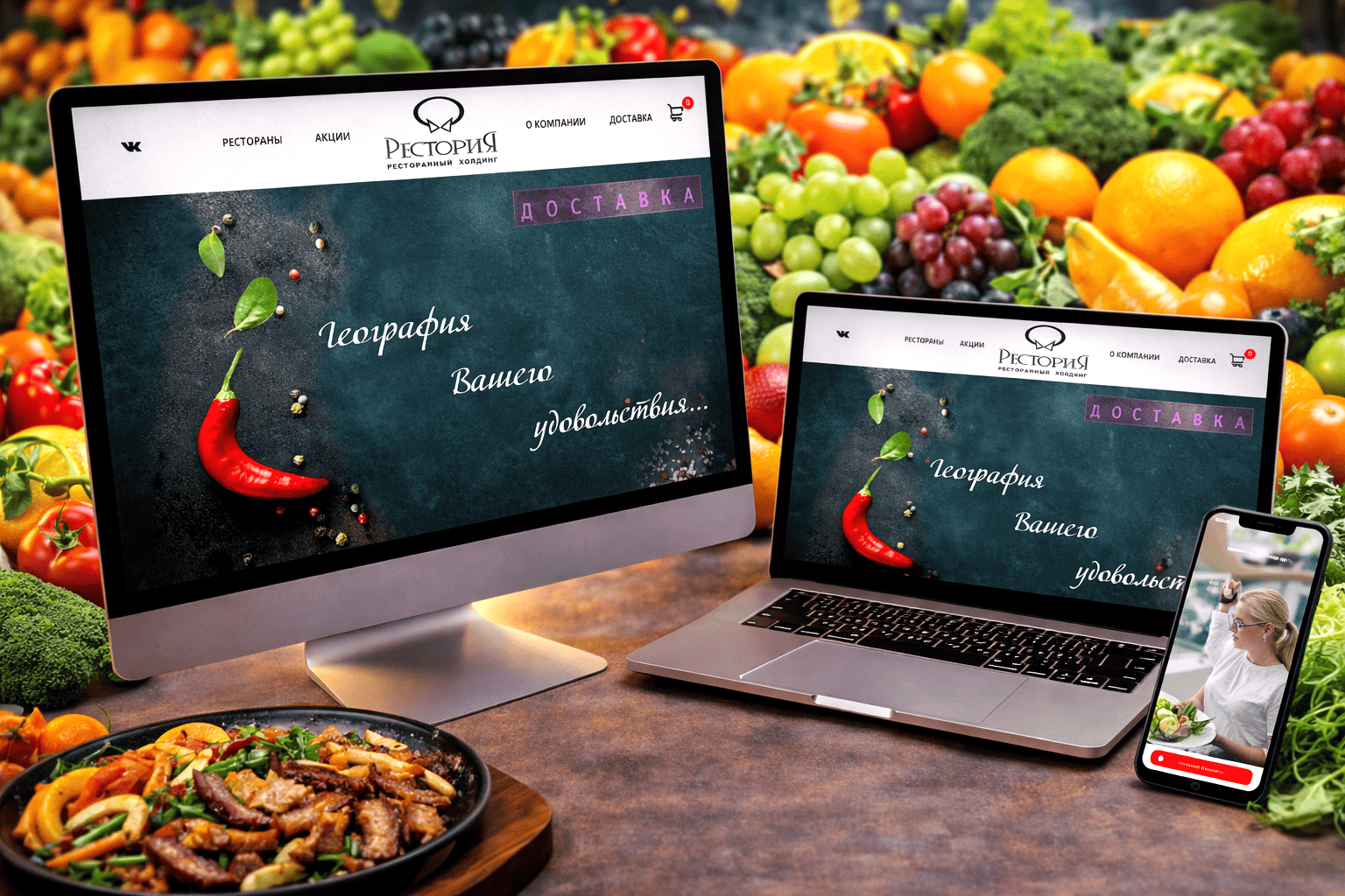 Адаптивная версия подчеркивает целостность решения. Еда на любом гаджете остается в центре внимания, композиция не распадается, а эмоциональный тон передается так же точно, как на большом экране. Этот сайт — плод труда веб-студии РОСТСАЙТ, продвижение — тоже.