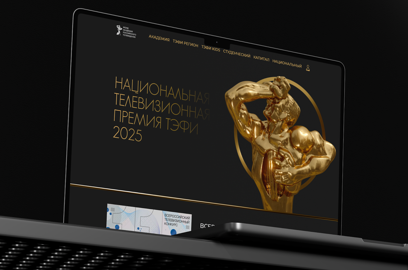 Тонкая типографика в благородном золотом оттенке гармонирует с основным фоном, создавая ощущение премиальности и сдержанного величия. Навигационное меню в верхней части экрана выдержано в минималистичном стиле, а отсутствие лишних элементов усиливает эффект изысканности. Акценты на деталях — тонкая золотая линия, разделяющая блоки, и мягкое свечение вокруг статуэтки — формируют визуальный баланс и подчеркивают статус мероприятия.