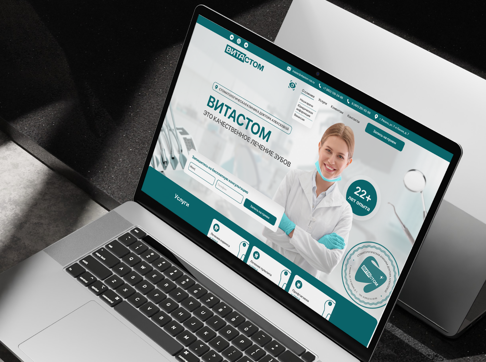 Формы записи на прием и блоки с информацией логично структурированы, обеспечивая удобство навигации. Вспомогательные графические элементы — иконки стоматологических инструментов и значок с указанием опыта клиники — добавляют визуальной завершенности и создают ощущение стабильности и опыта.