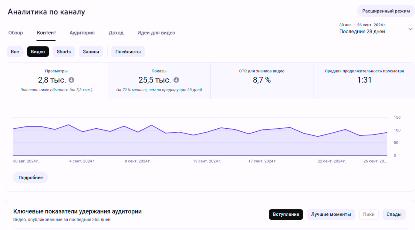 5. Коэффициент удержания аудитории: показывает, на каких моментах зрители теряют интерес.